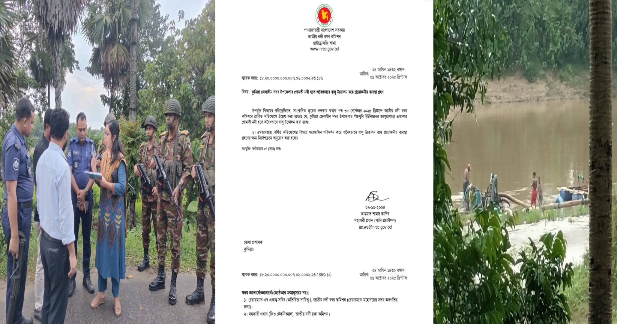 সিনিয়র রিপোর্টার জুয়েল খন্দকার:- বেশ কিছু দিন যাবৎ রাজনৈতিক প্রভাব খাটিয়ে একটি কুচক্র মহল কুমিল্লা সদরের পাঁচথুবী ইউনিয়নের জালুয়া পাড়া এলাকার বর্ডার রোড গোমতী নদী থেকে অবৈধ ভাবে ড্রেজার লাগিয়ে বালু উত্তোলন এর বিষয় সংবাদ প্রকাশের পর গত ০৮ অক্টোবর ২০২৫ইং তারিখ গোমতী নদী থেকে অবৈধ ভাবে ড্রেজার দিয়ে বালু উত্তোলনে দায়ে ভ্রাম্যমাণ আদালতের ম্যাজিস্ট্রেট সদর উপজেলা সহকারী কমিশনার (ভূমি) তানজিনা জাহান সেনাবাহিনী সহ যৌথ অভিযান পরিচালনা করে ১০ লক্ষ টাকা জরিমানা করেন ও পানি উন্নয়ন বোর্ডের এক প্রকৌশলীকে তিন মাসের কারাদণ্ড প্রধান করেন। পরে নদী রক্ষা কমিশন বরাবর একটি অভিযোগ দায়ের করলে ০৯ অক্টোবরে কুমিল্লা ডিসিকে ড্রেজারের বিষয় পদক্ষেপ গ্রহণের জন্য একটি চিঠি ইস্যু করেন নদী রক্ষা কমিশন। তবে নদী রক্ষা কমিশনের চিঠির বিষয় এখনো কোন পদক্ষেপ গ্রহণ করেনি কুমিল্লার প্রশাসন।
