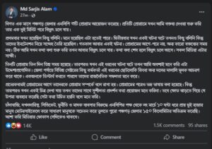 পোস্টে পঞ্চগড়ে এনসিপির পথসভায় বিদ্যুৎ বিভ্রাট নিয়ে হতাশা প্রকাশ করে সারজিস লিখেছেন, বিগত এক মাসে পঞ্চগড় জেলায় এনসিপি ৩টি প্রোগ্রাম আয়োজন করেছে। প্রতিটি প্রোগ্রামে যখন আমি বক্তব্য দেওয়া শুরু করি তার এক দুই মিনিট পরে বিদ্যুৎ চলে যায়।